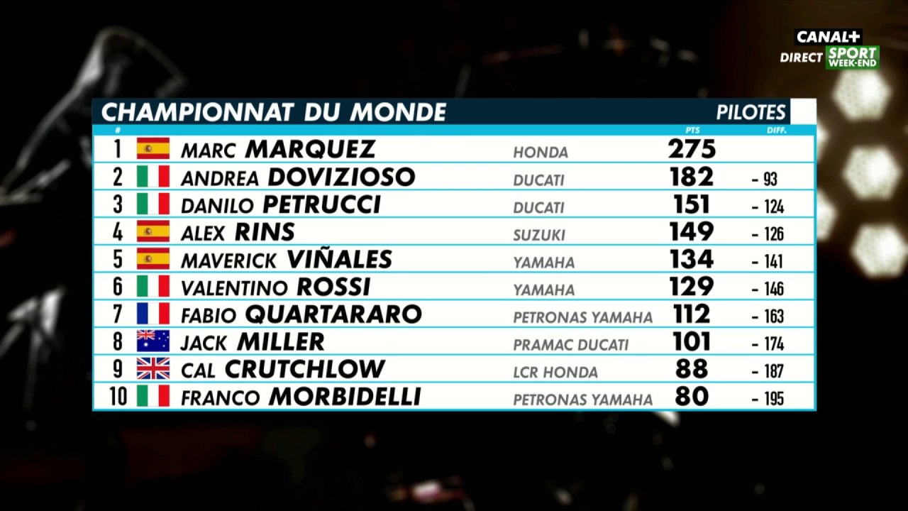 Moto Gp Classement - Motogp Le Classement Des Pilotes Team ... from dicodusport.fr Retrouvez en un clic les résultats et classements 2021 des pilotes, équipes et constructeurs de motogp Jul 02, 2021 · classement pilotes auto moto. Directs commentés, images et vidéos à regarder et à partager ! Présentations, prix, dates de sortie, prospectives et, bien sûr, nos premiers essais ! May 30, 2021 · le pilote suisse de moto3 jason dupasquier, accidenté samedi en qualifications du grand prix d'italie, est décédé à l'âge de 19 ans dimanche, a annoncé le promoteur du championnat de monde. Les informations, résultats et classements de tous les sports. Jun 05, 2011 · le sport en direct sur l'équipe. Nous utilisons des cookies et des outils similaires qui sont nécessaires pour vous permettre d'effectuer des achats, pour améliorer votre expérience d'achat et fournir nos services, comme détaillé dans notre avis sur les cookies.